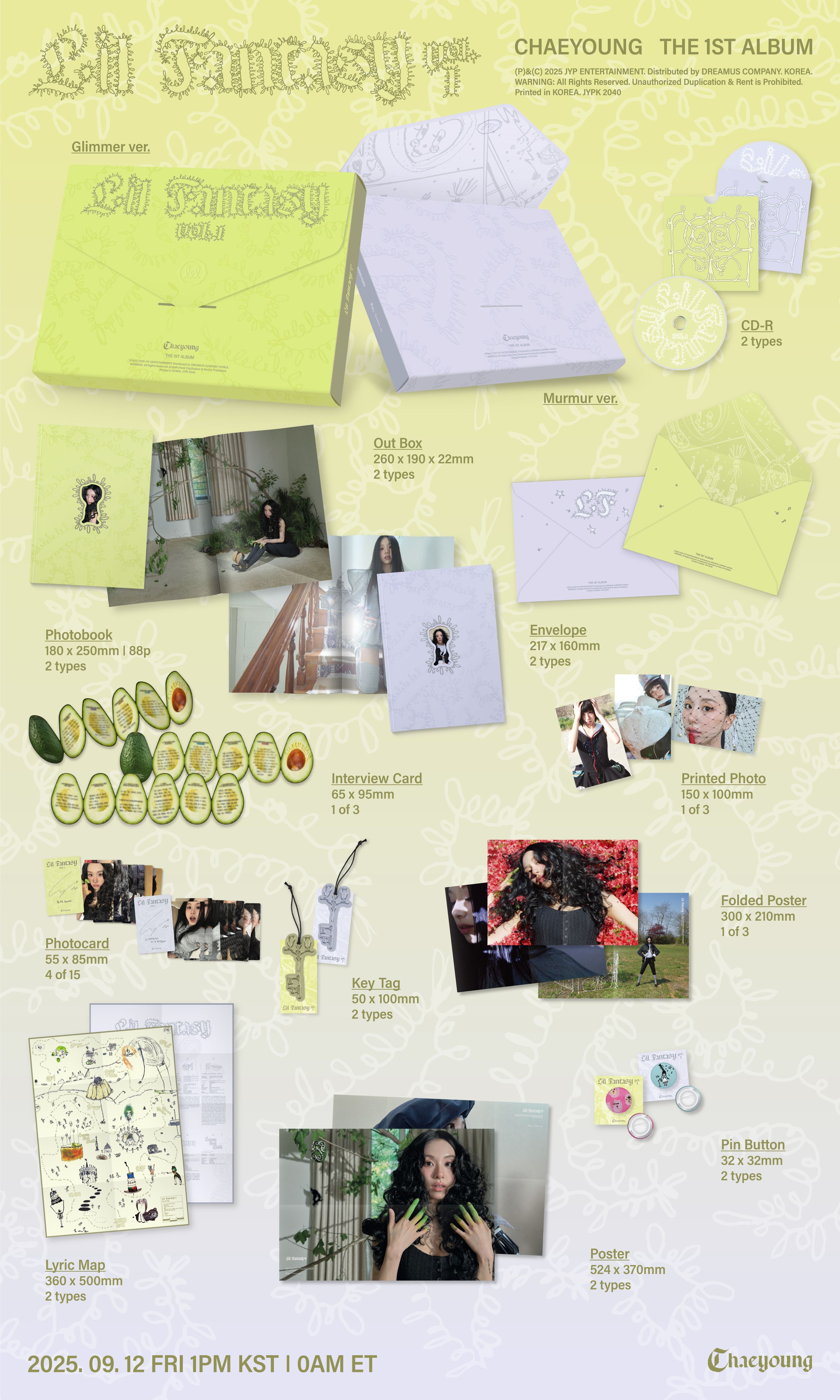 CHAEYOUNG (TWICE) -"LIL FANTASY vol.1" [Glimmer ver.] Follow up to her participation in hit song "TAKEDOWN" from global hit film KPop Demon Hunters, CHAEYOUNG of TWICE releases her debut solo album titled 'LIL FANTASY vol.1.' Available in two standard versions - Glimmer ver. And Murmur ver. Contents of the album include: CD, Outbox, Photobook (96pg), Envelope, Interview Card (1 of 3), Printed Photo (1 of 3), Photocard (4 of 15), Key Tag, Folded Poster (1 of 3), Lyric Map, Poster, Pin Button. Dimensions: 260 x 190 x 22 mm.