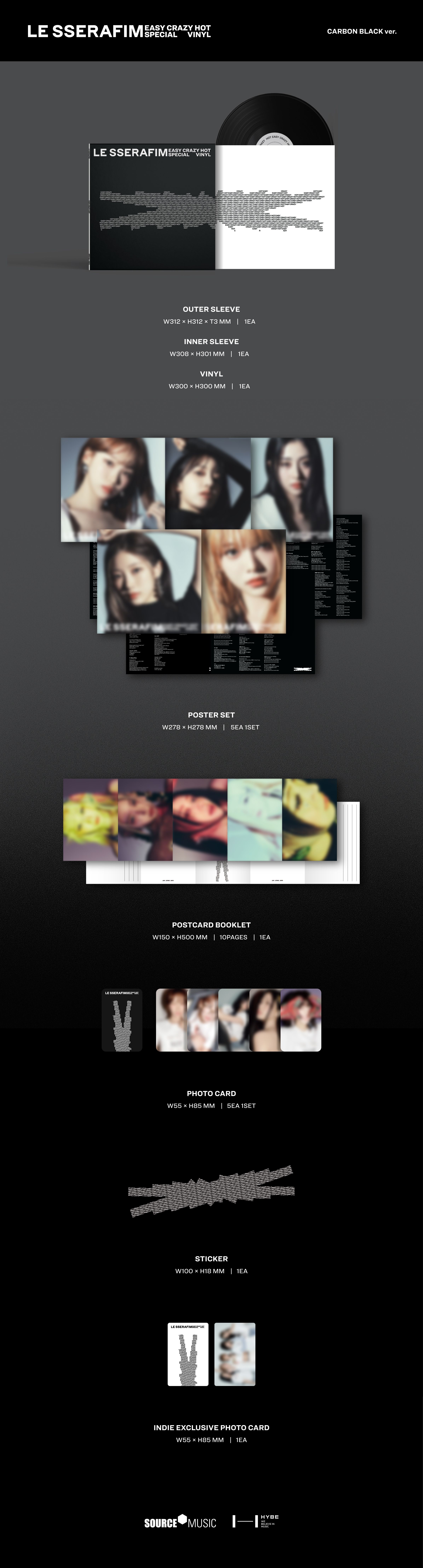 In the midst of their ‘EASY CRAZY HOT World Tour,’ leading K-Pop girl group LE SSERAFIM (KIM CHAEWON, SAKURA, HUH YUNJIN, KAZUHA & HONG EUNCHAE) release a corresponding special vinyl titled ‘EASY-CRAZY-HOT’ featuring all their global hit songs. Available in two vinyl disc colors – SILVER WHITE and CARBON BLACK, includes Outer Sleeve, Inner Sleeve, Poster Set (5ea), Postcard Booklet (10pg), Photocard Set (5ea) and Sticker. Dimensions: 312 x 312 x 3 mm.